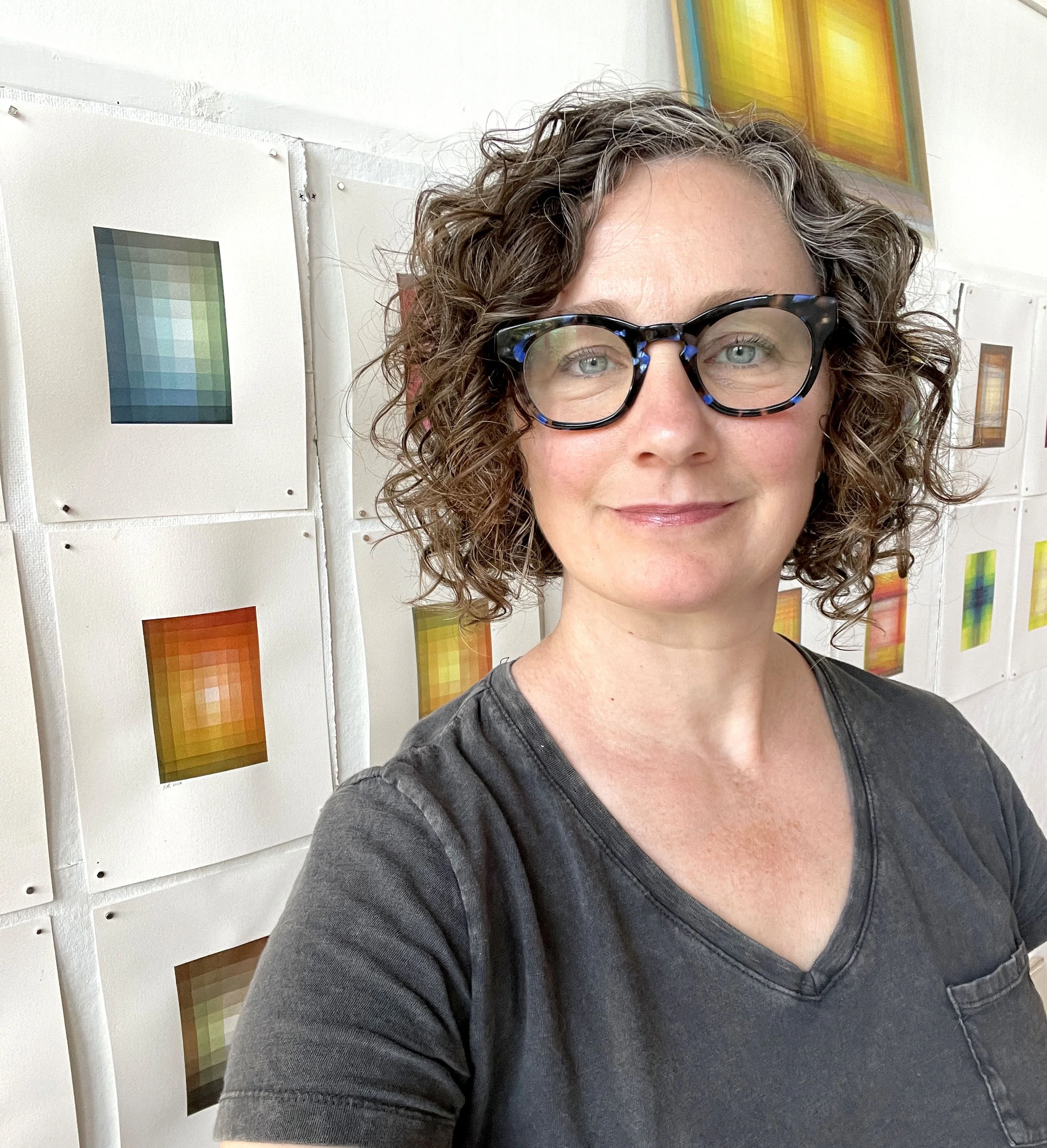 Roberts’ recent paintings are made of one section, or stripe of color, at a time, increasing in opacity, from the center out. This system allows her to “weave” the colors together, making small shifts from band to band, so the light at the center remains, and the image as a whole, sparkles. The colors come from photos of her daily life which are analyzed for hue, intensity, and amount. “Depending on what kind of day I’ve had, I work to control my breathing to make the straightest lines and edges I can. I rely on the process of repetition to take me on a journey toward the resulting image which, in the end, is a result of hundreds of choices about color relationships. The more surprised I am at the end, the better. Standing in front of the paintings, viewers have a similar experience, like wandering through a space, looking through a window, or walking through a door.”